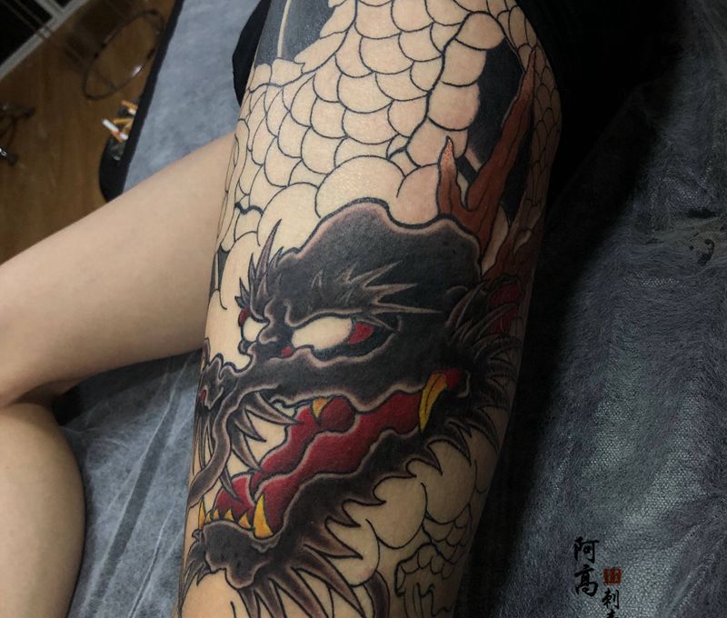 • T网红王老大花腿龙纹身图片_腿部新传统纹身图案