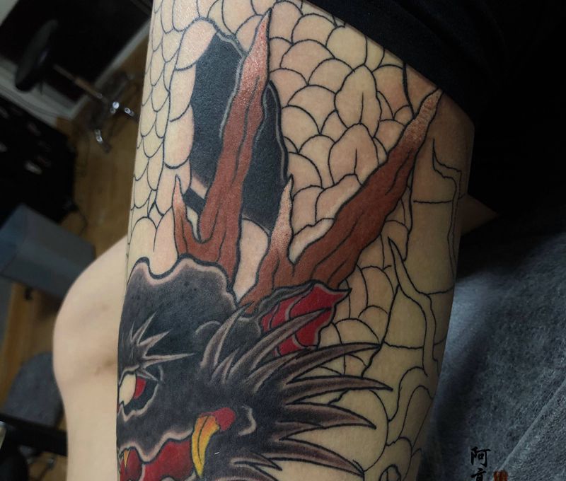 • T网红王老大花腿龙纹身图片_腿部新传统纹身图案