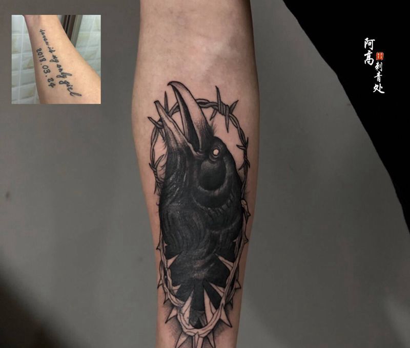 乌鸦遮盖纹身图片_手臂New School纹身图案