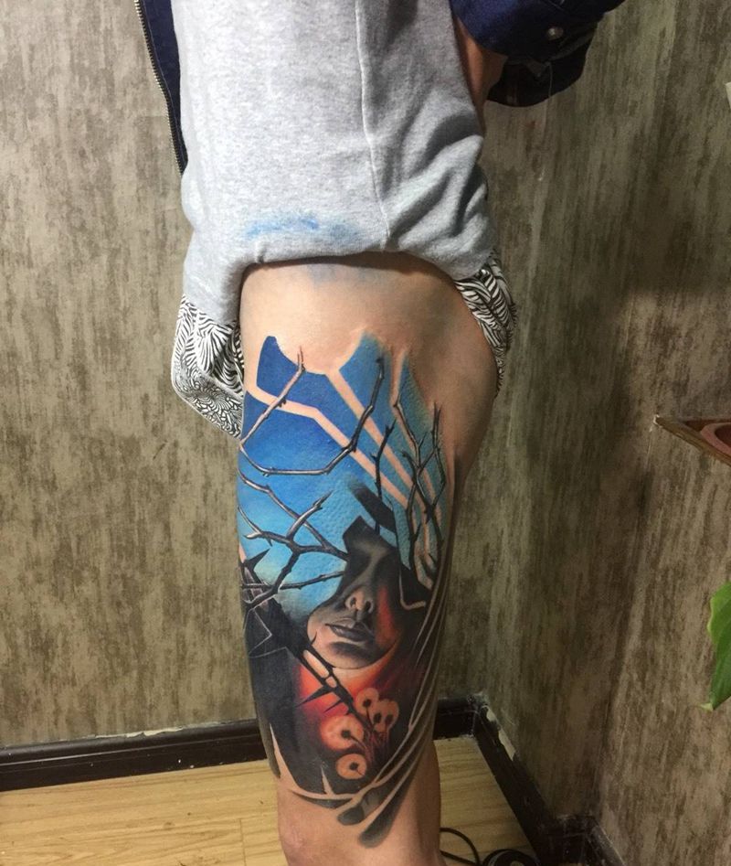 • T网红王老大花腿龙纹身图片_腿部新传统纹身图案