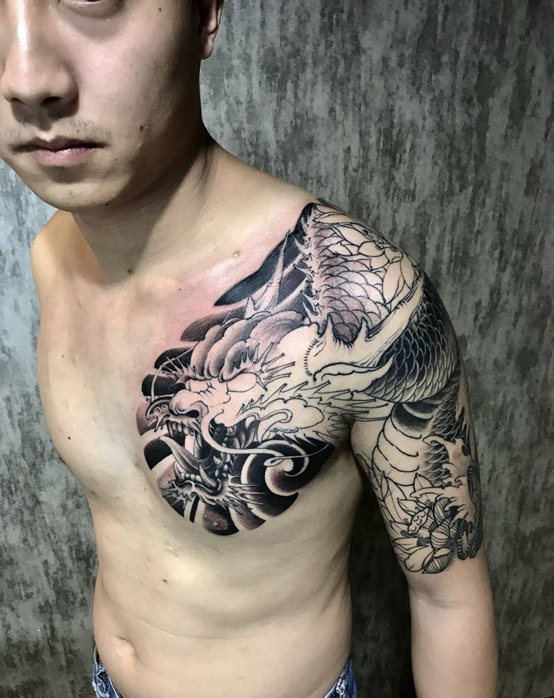 当前位置: 首页 >福建省福州市纹身店-刺古纹身会所纹身图案>黑灰半甲龙纹身图片