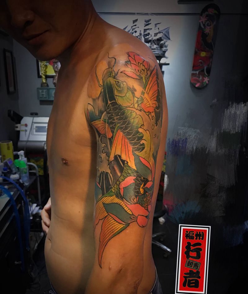 当前位置: 首页 >福建省福州市纹身店-行者刺青纹身图案>鲤鱼纹身图片_手臂手部新传统鲤鱼荷花纹身图案