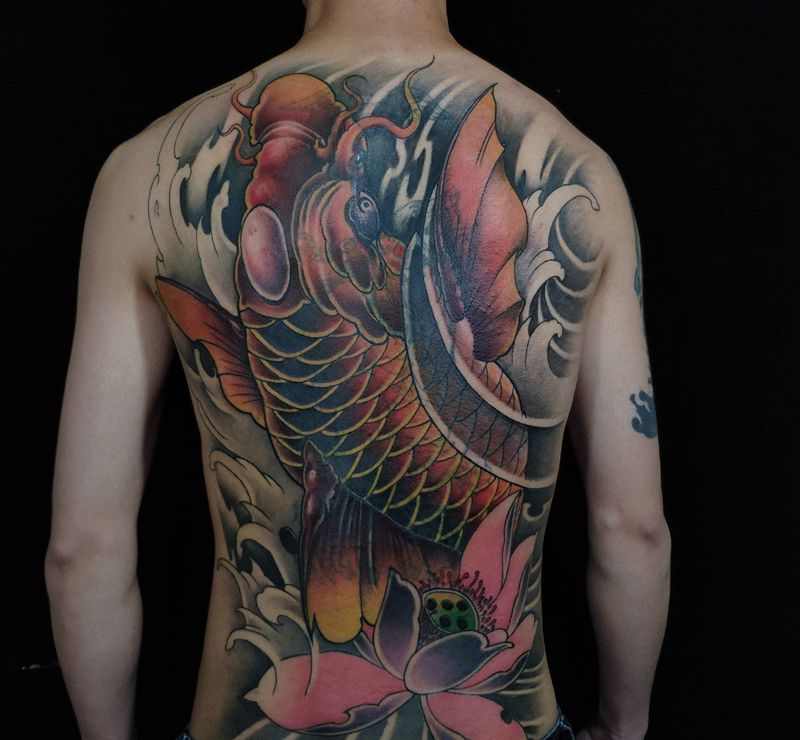 当前位置: 首页 >广东省深圳市纹身店-焱轩堂刺青艺术馆纹身图案>鲤鱼遮盖纹身图片_背部纹身图案