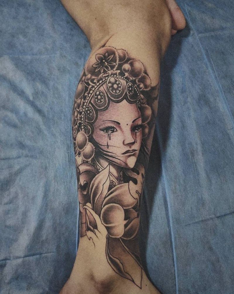 当前位置: 首页 >广东省深圳市纹身店-焱轩堂刺青艺术馆纹身图案>艺伎纹身图片_脚部腿部纹身图案