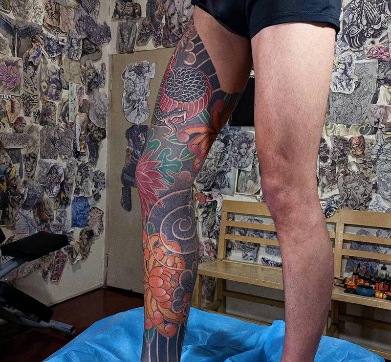 • T网红王老大花腿龙纹身图片_腿部新传统纹身图案
