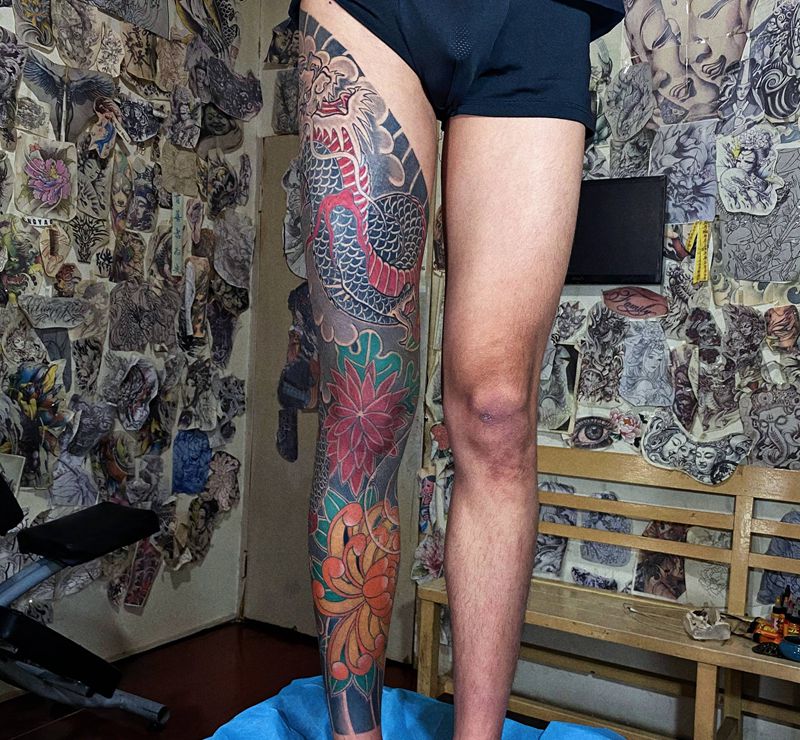 • T网红王老大花腿龙纹身图片_腿部新传统纹身图案
