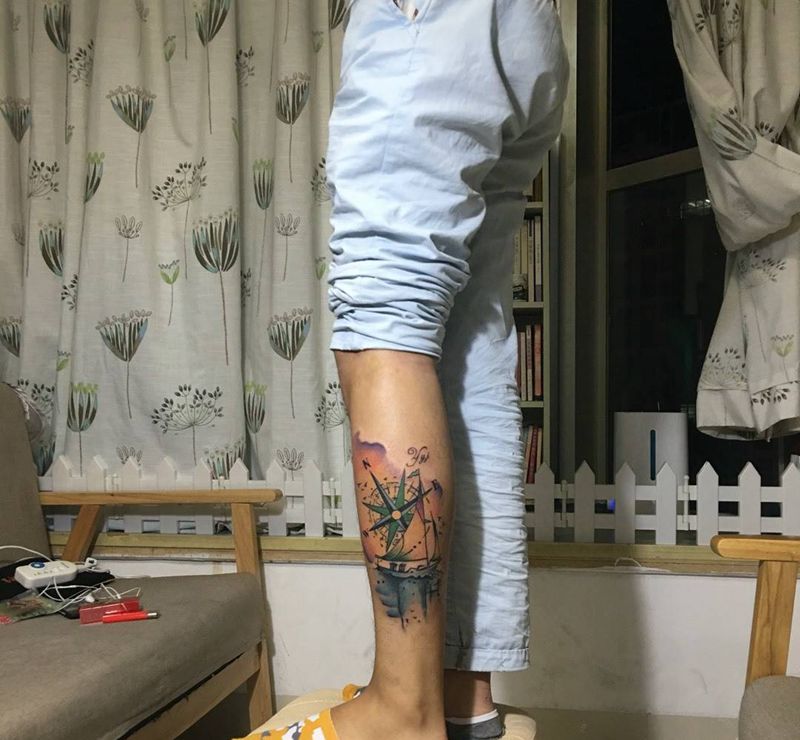 水彩帆船纹身图片_成品腿部欧美纹身图案
