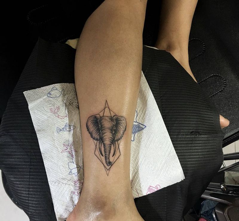 欧美象纹身图片_成品腿部欧美几何动物纹身图案