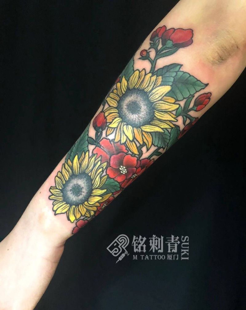 彩色欧美花卉纹身图片_手臂Old School纹身图案