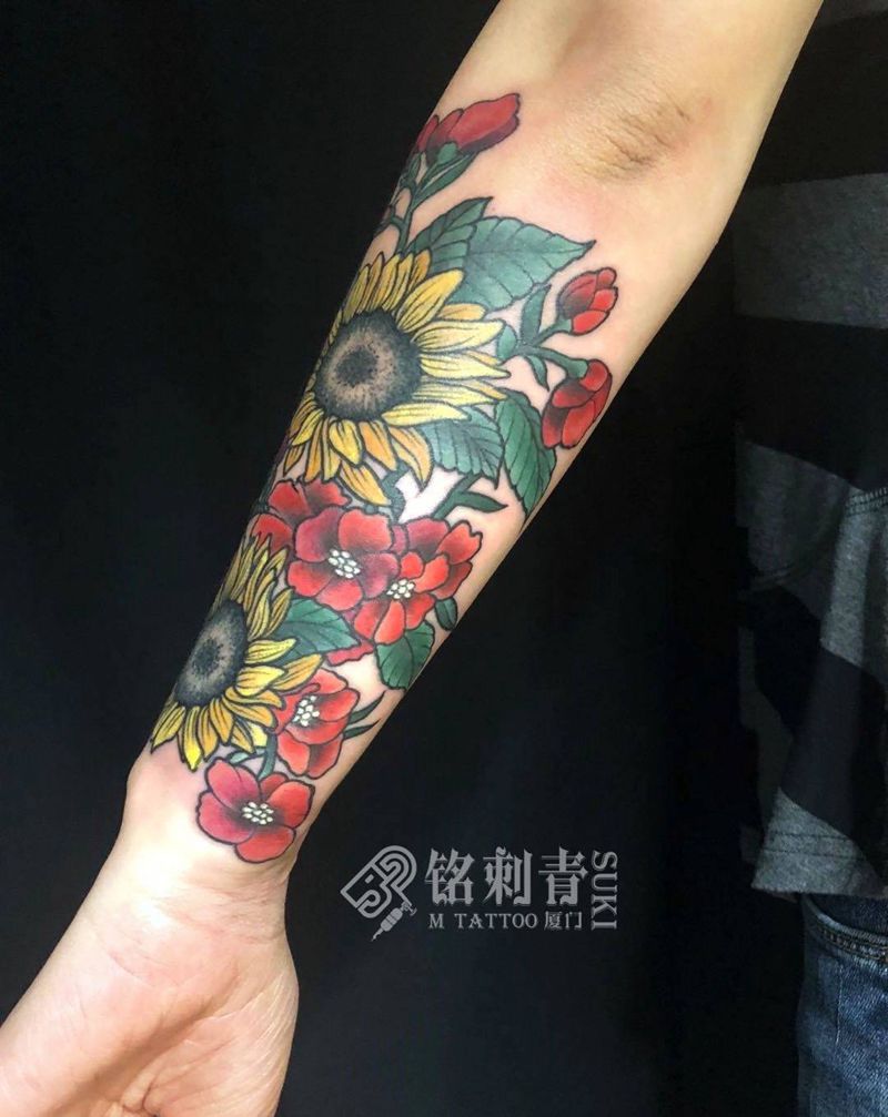 当前位置: 首页 >福建省厦门市纹身店-厦门铭刺青纹身图案>彩色欧美花卉纹身图片_手臂Old School纹身图案