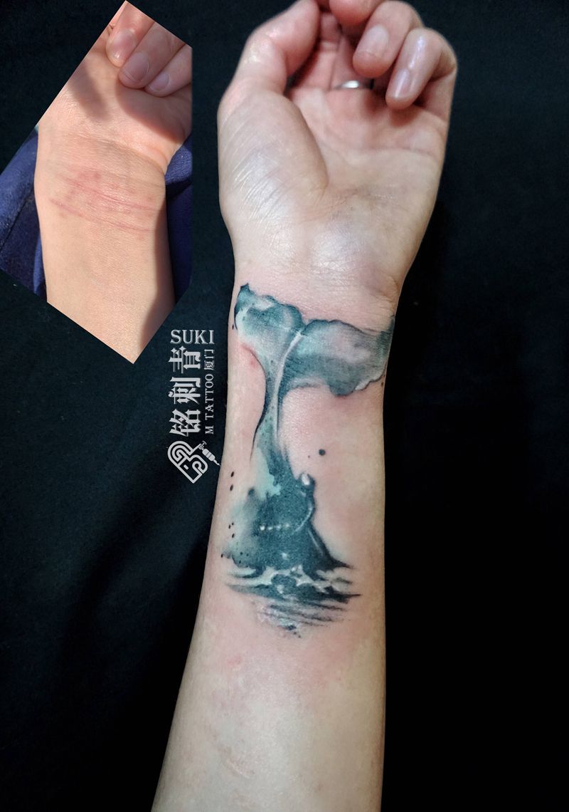 当前位置: 首页 >福建省厦门市纹身店-厦门铭刺青纹身图案>鲸鱼尾纹身图片_手臂水墨水彩纹身图案