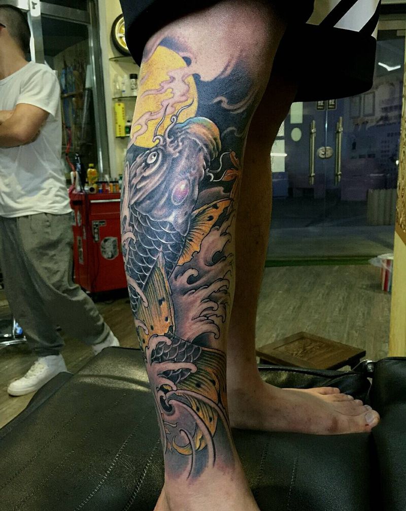 鲤鱼半包小腿纹身图片_腿部脚部传统清新鬼神宗教原创厦门福建成品纹身图案