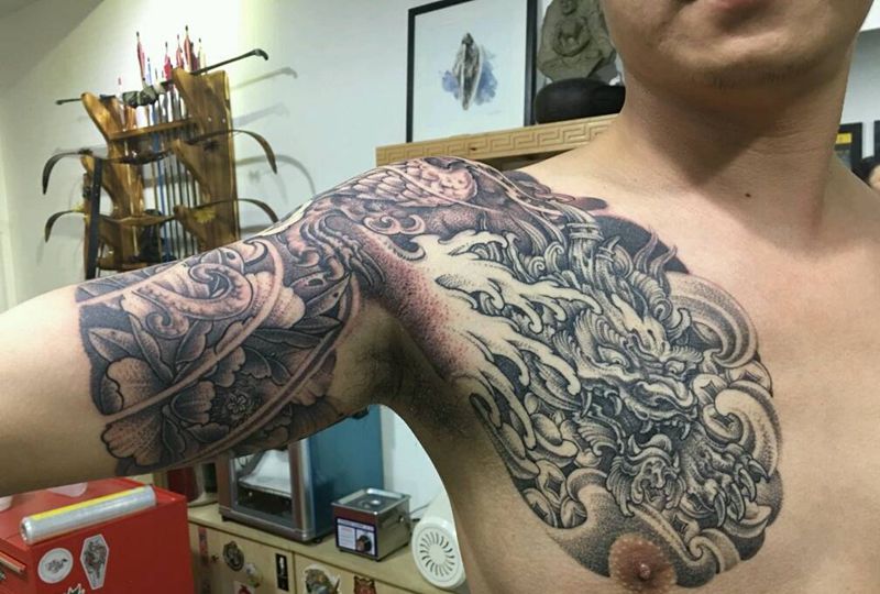 貔貅半胛纹身纹身图片_胸部手臂传统清新鬼神厦门福建貔貅麒麟成品纹身图案
