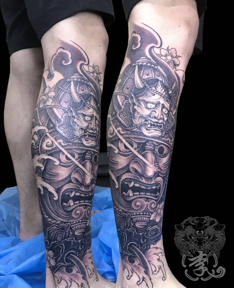武士兜纹身图片_成品腿部传统鬼神人物厦门水墨佛像纹身图案