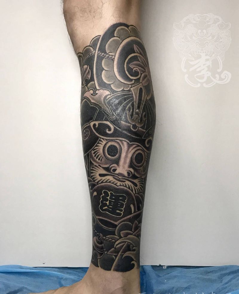 当前位置: 首页 >福建省厦门市纹身店-小李刺青纹身图案>老传统达摩蛋纹身图片_成品腿部传统人物宗教鬼神原创厦门佛像水墨纹身图案
