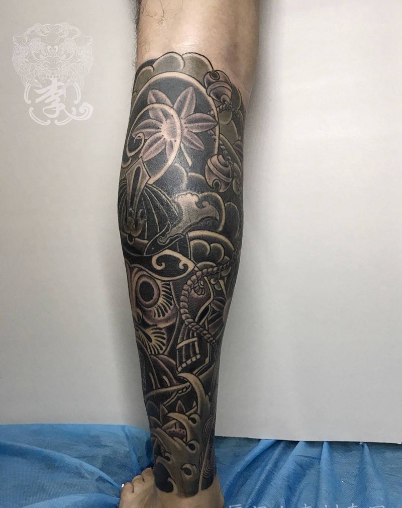 老传统达摩蛋纹身图片_成品腿部传统人物宗教鬼神原创厦门佛像水墨纹身图案