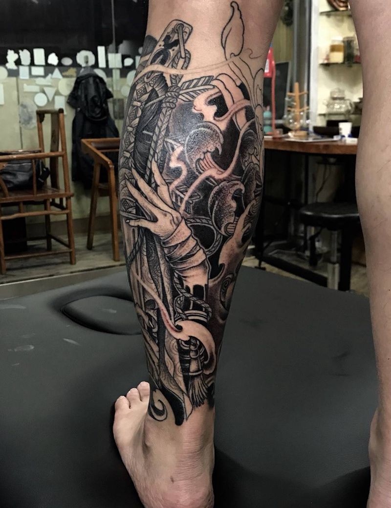 • T网红王老大花腿龙纹身图片_腿部新传统纹身图案