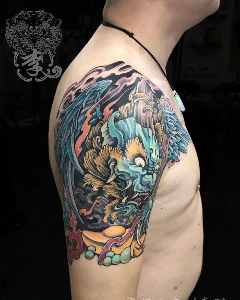 貔貅纹身图片_成品肩部胸部手臂传统鬼神宗教厦门佛像水墨纹身图案