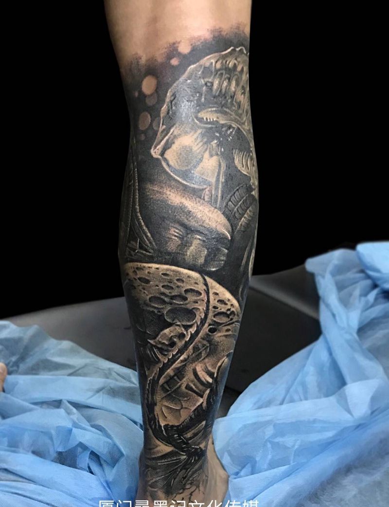 异形纹身图片_脚部腿部欧美写实水墨厦门机械异形纹身图案