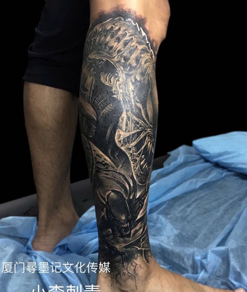 异形纹身图片_脚部腿部欧美写实水墨厦门机械异形纹身图案