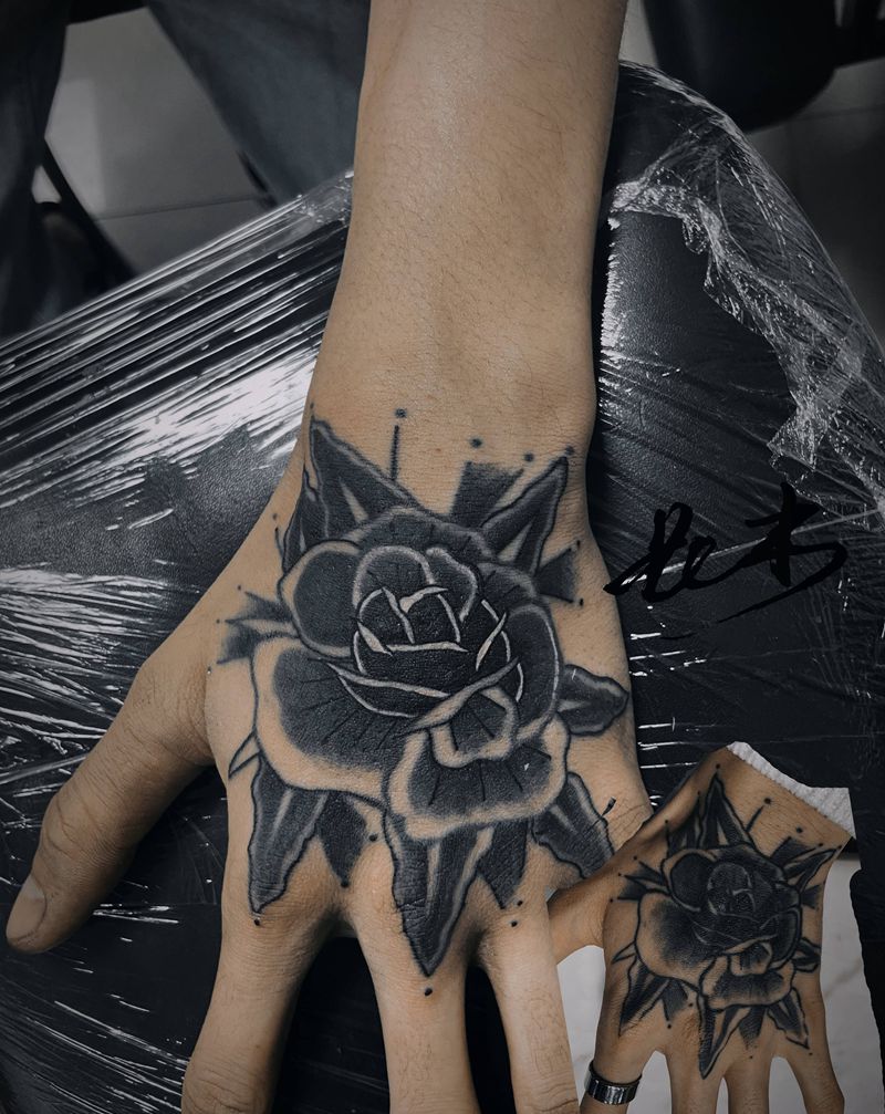 • 手背潮流时尚的玫瑰花眼睛纹身图案