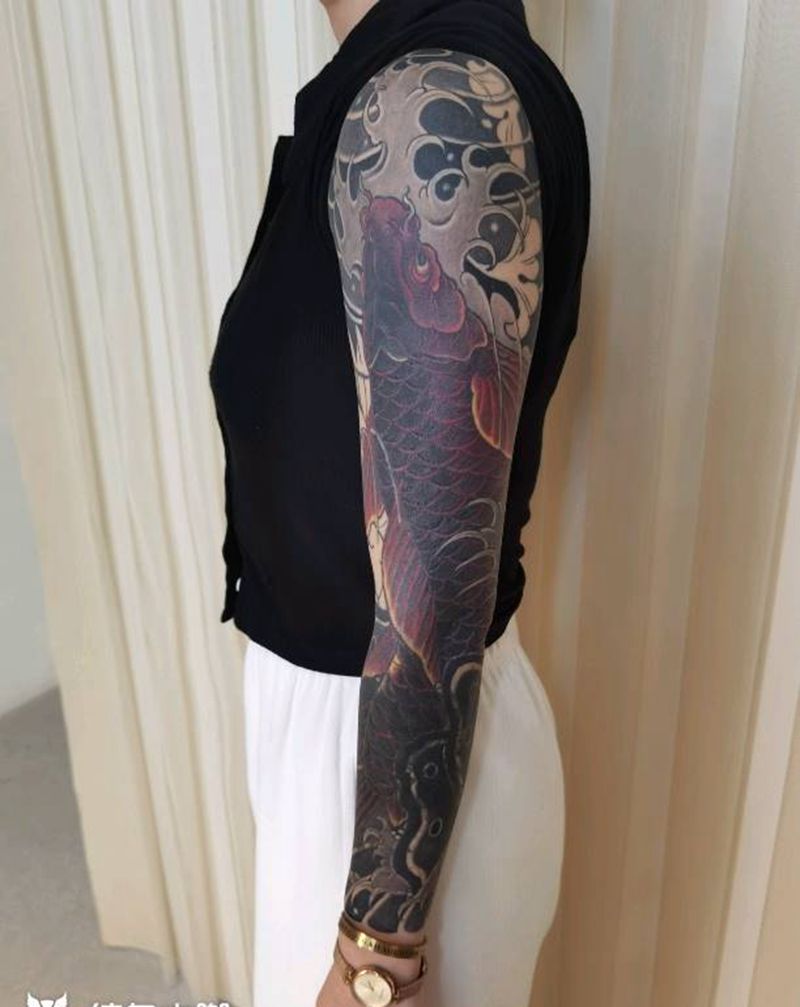 老传统鲤鱼花臂纹身图片_手臂老传统纹身图案