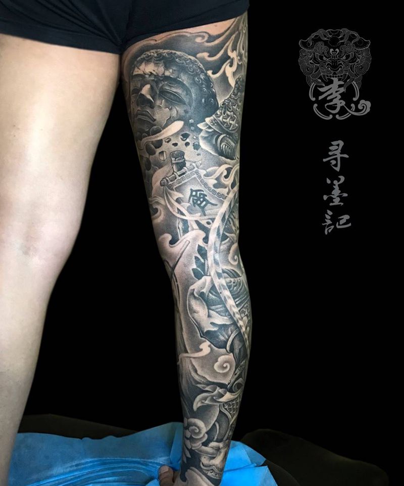 成佛纹身图片_腿部脚部新传统点刺厦门扫针针痕纹身图案
