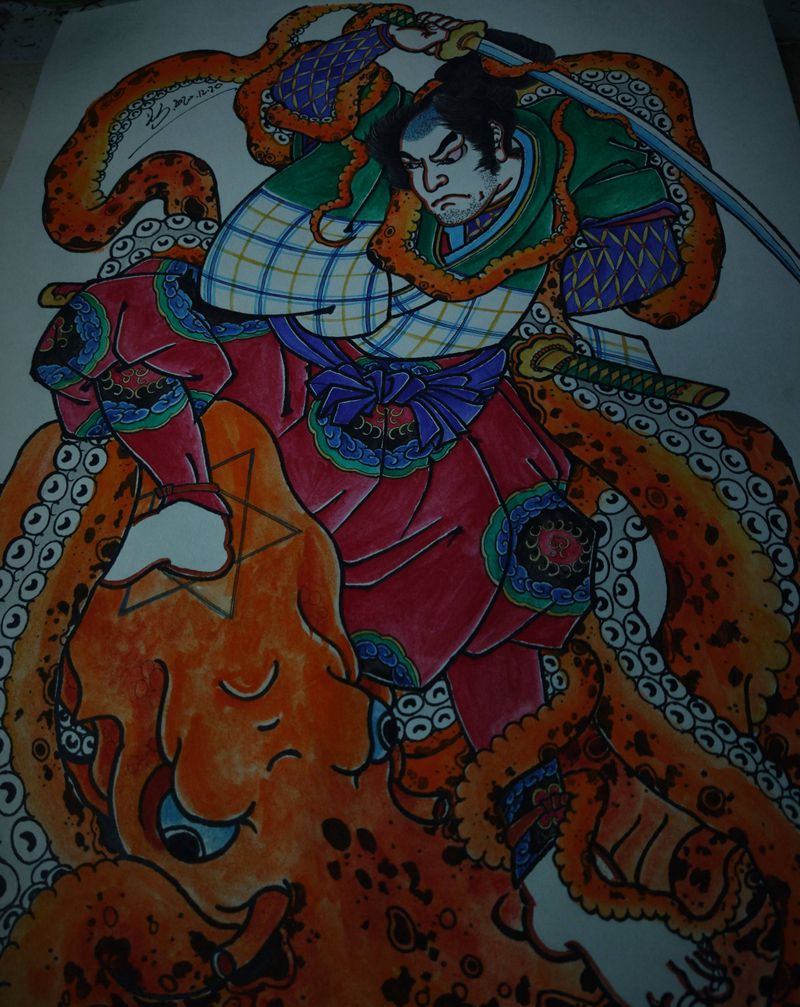 当前位置: 首页 >福建省厦门市纹身店-厦门踢米刺青纹身图案>自画手稿,老传统满背手稿上身效纹身图片_背部老传统纹身图案