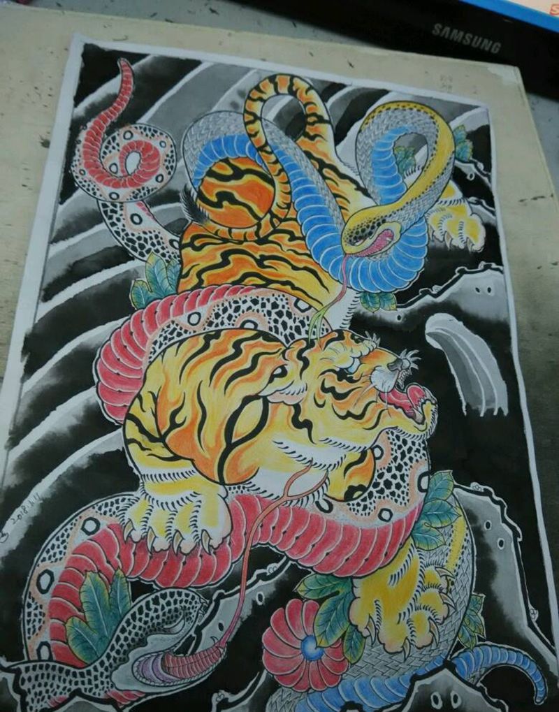 传统手稿-虎与蛇纹身图片_背部腿部传统动物图腾原创手稿纹身图案