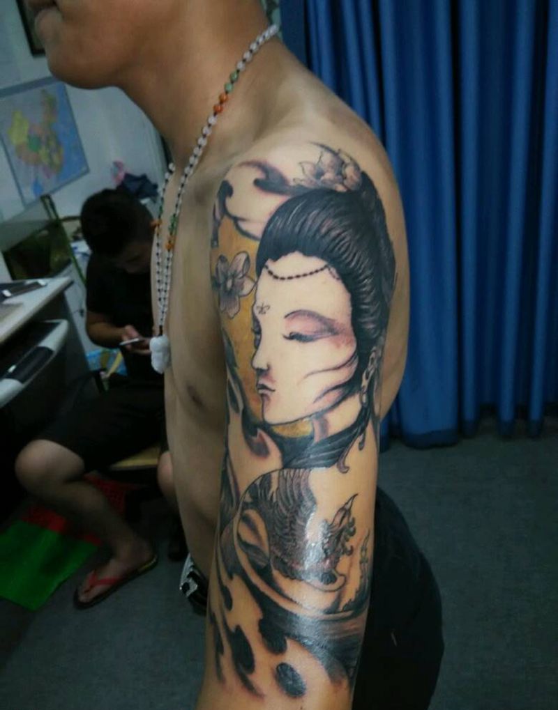 当前位置: 首页 >福建省厦门市纹身店-厦门踢米刺青纹身图案>大臂艺妓纹身图片_手臂欧美传统肖像清新人物成品纹身图案