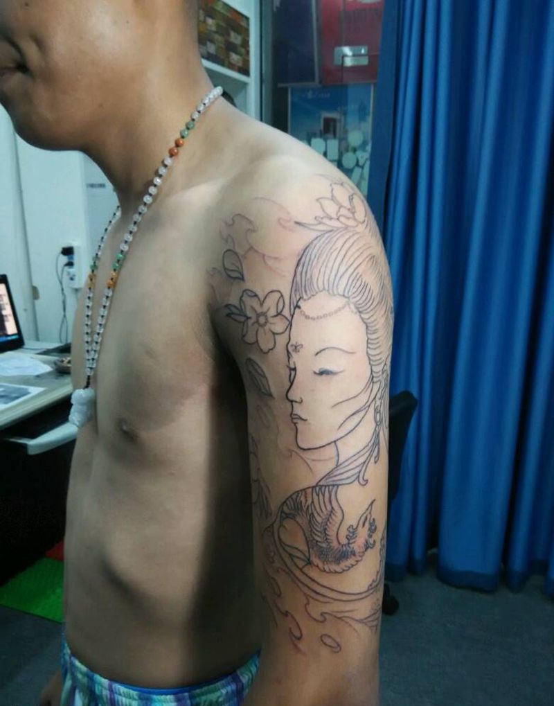 大臂艺妓线条完成纹身图片_手臂传统习俗肖像清新国画人物鬼神成品纹身图案