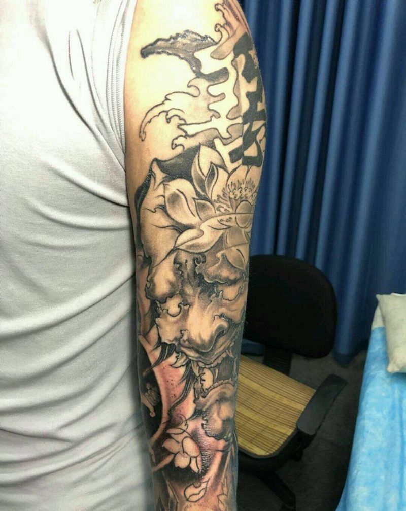 当前位置: 首页 >福建省厦门市纹身店-厦门踢米刺青纹身图案>接图花臂,黑灰部分完成纹身图片_手臂传统习俗肖像写实人物鬼神原创成品纹身图案