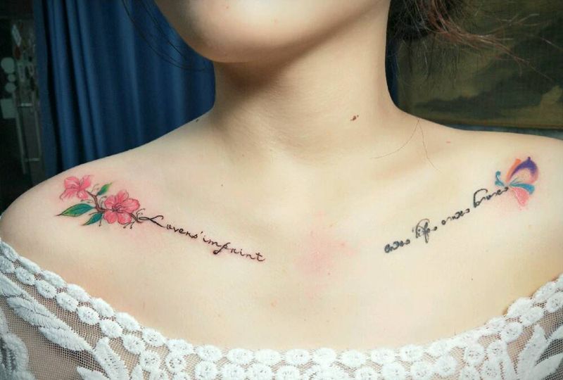 锁骨英文小花小清新纹身图片_肩部胸部欧美清新字符植物静物原创成品纹身图案