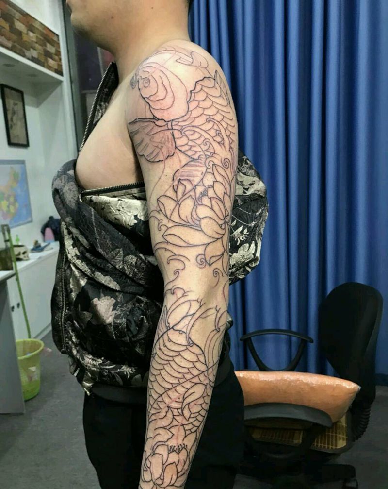 传统鲤鱼花臂(未完成)纹身图片_手臂传统习俗写实动物植物鬼神宗教原创成品纹身图案