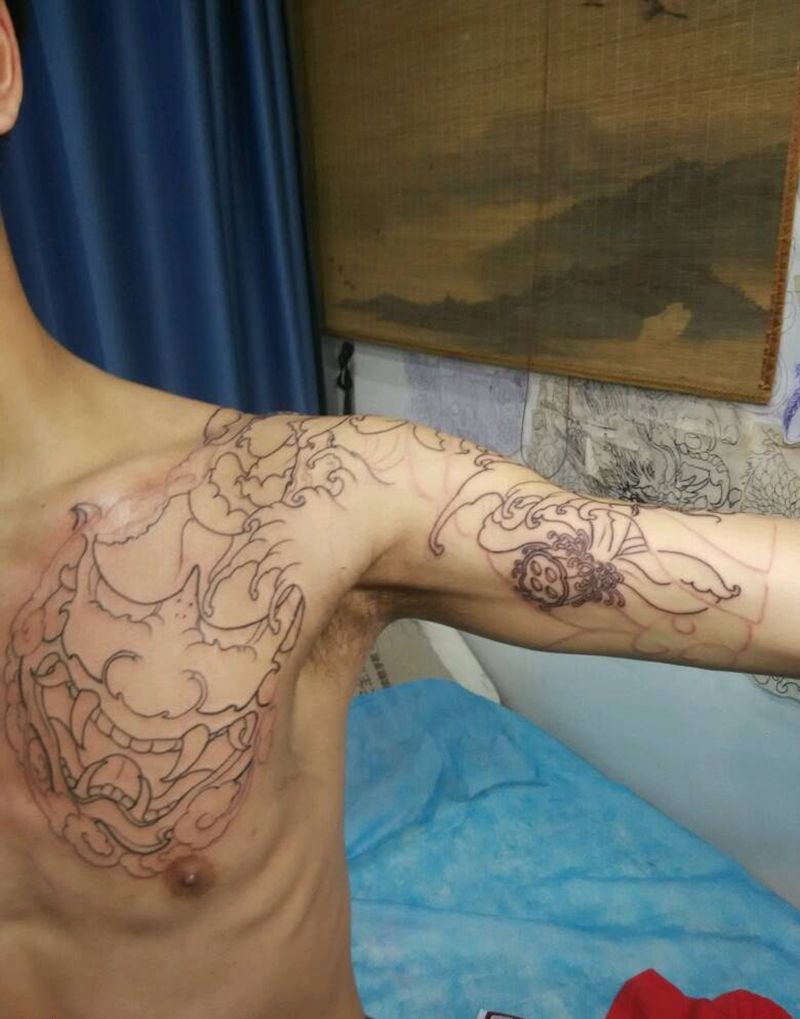 当前位置: 首页 >福建省厦门市纹身店-厦门踢米刺青纹身图案>原创传统半胛,线条完成纹身图片_肩部胸部手臂传统动物植物鬼神原创纹身图案