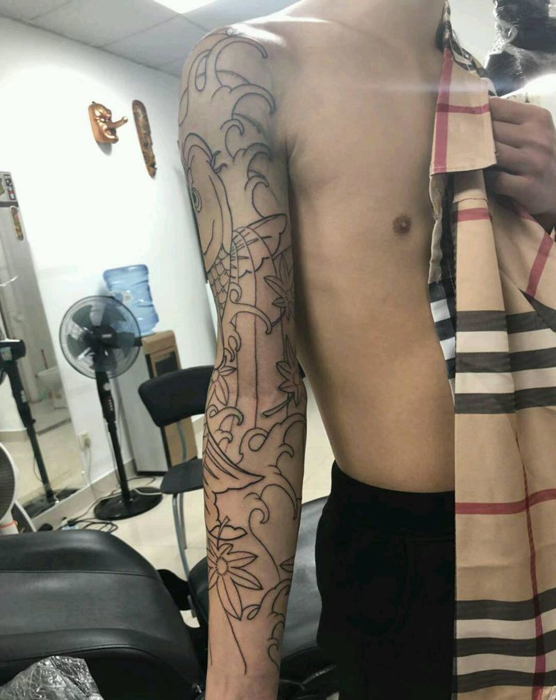 老传统鲤鱼花臂,线条纹身图片_手臂老传统鲤鱼纹身图案