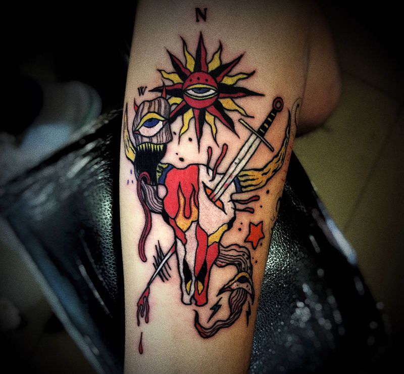• T包小腿吹火男+阿多福纹身图片_腿部老传统新传统吹火男阿