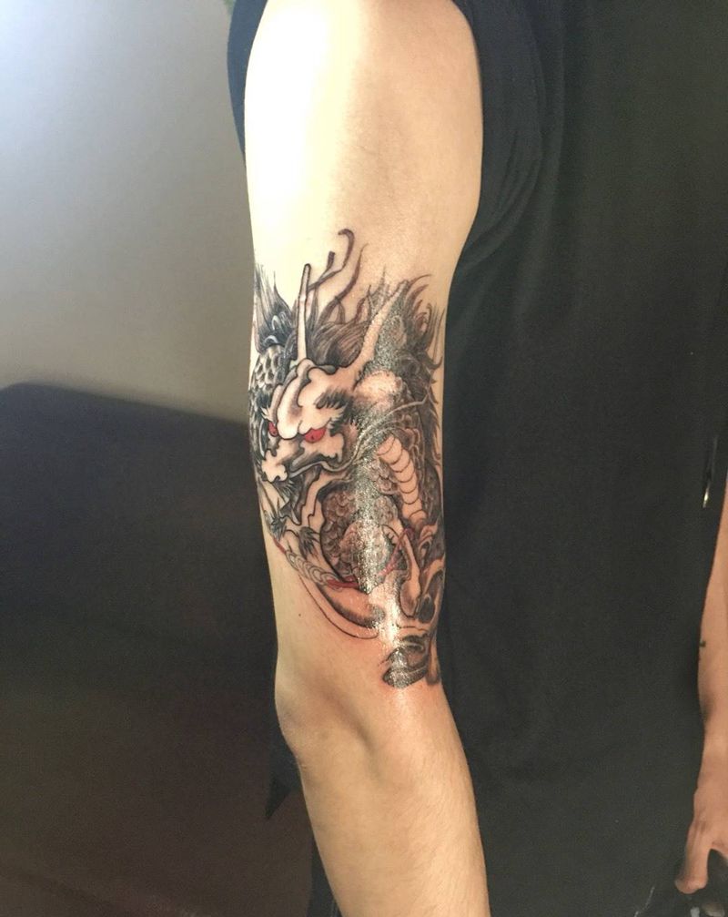 • T网红王老大花腿龙纹身图片_腿部新传统纹身图案