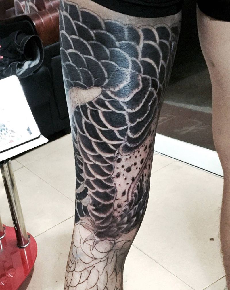 • T网红王老大花腿龙纹身图片_腿部新传统纹身图案