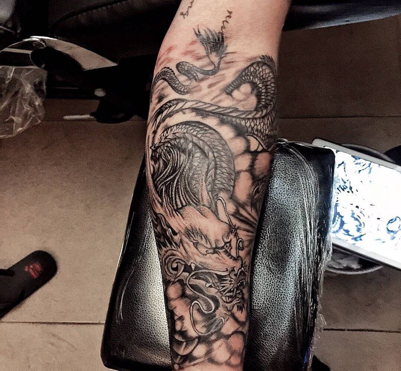 • T网红王老大花腿龙纹身图片_腿部新传统纹身图案