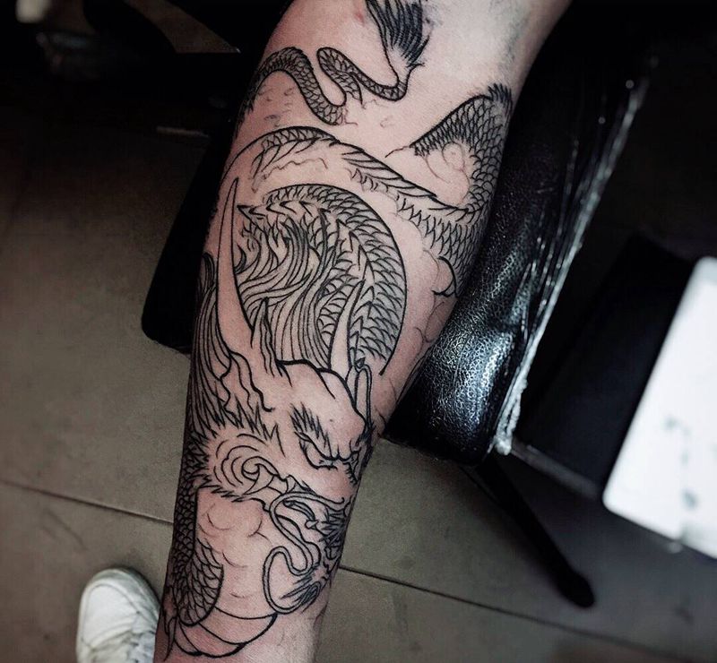 • T网红王老大花腿龙纹身图片_腿部新传统纹身图案