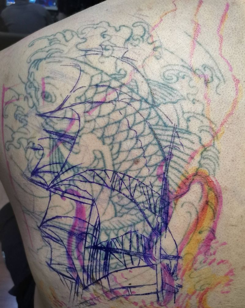 当前位置: 首页 >福建省莆田市纹身店-楠岸纹身_NA-Tattoo纹身图案>-遮盖纹身图片_背部欧美写实帆船章鱼灯塔纹身图案