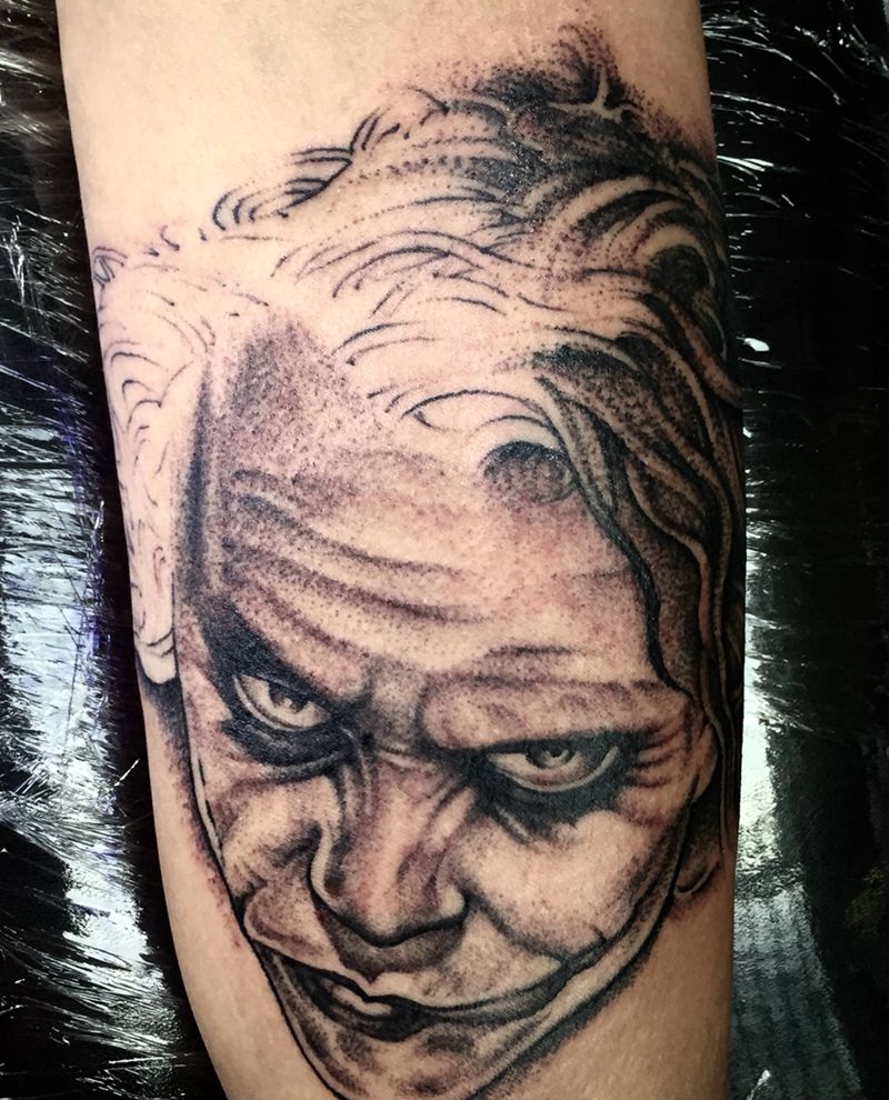 当前位置: 首页 >福建省莆田市纹身店-楠岸纹身_NA-Tattoo纹身图案>小丑纹身图片_手臂欧美写实肖像小丑纹身图案