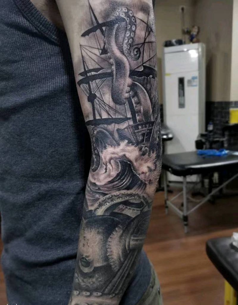 -一个遮盖引发的花臂纹身图片_手臂欧美写实花臂波塞冬章鱼纹身图案