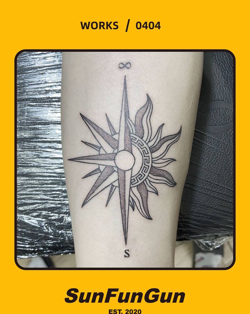当前位置: 首页 >福建省厦门市纹身店-SFG TATTOO纹身图案>太阳纹身图片_手臂点刺指南针太阳纹身图案