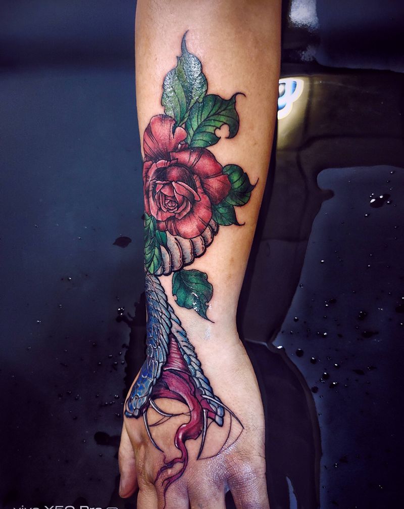 当前位置: 首页 >福建省厦门市纹身店-精彩文生纹身图案>美丽背后纹身图片_手臂欧美写实Old School纹身图案