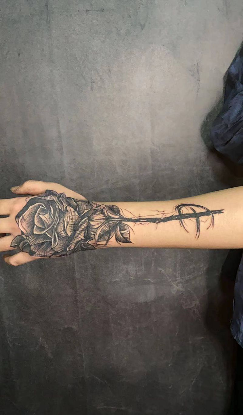 暗黑系玫瑰,花手纹身图片_手部水墨点刺纹身图案