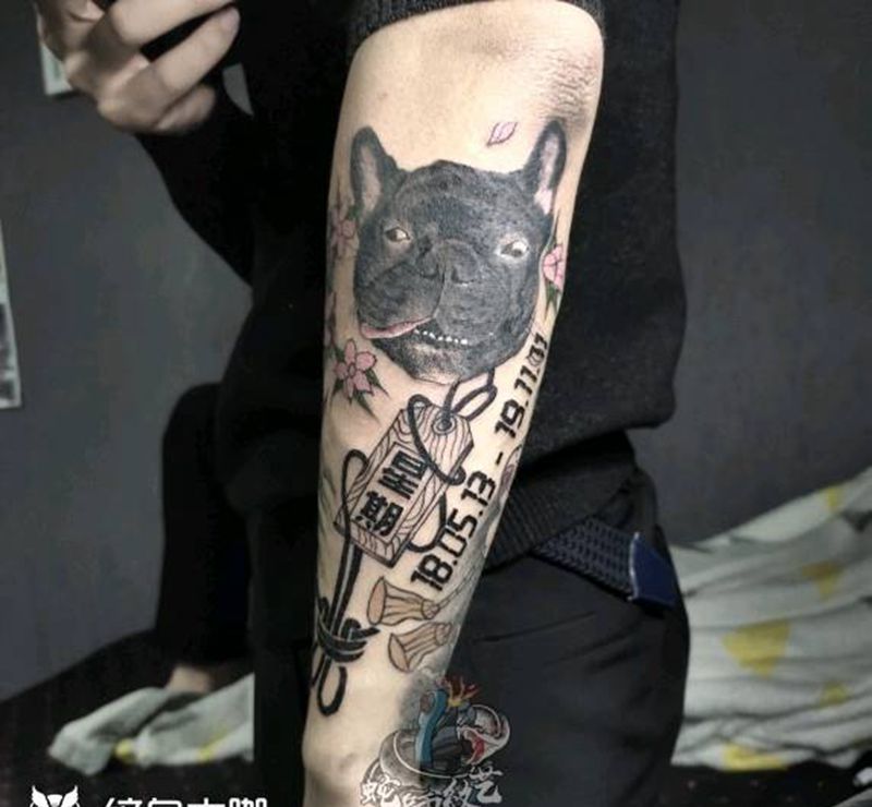 纪念爱宠纹身图片_手臂New School欧美写实宠物狗法斗纹身图案
