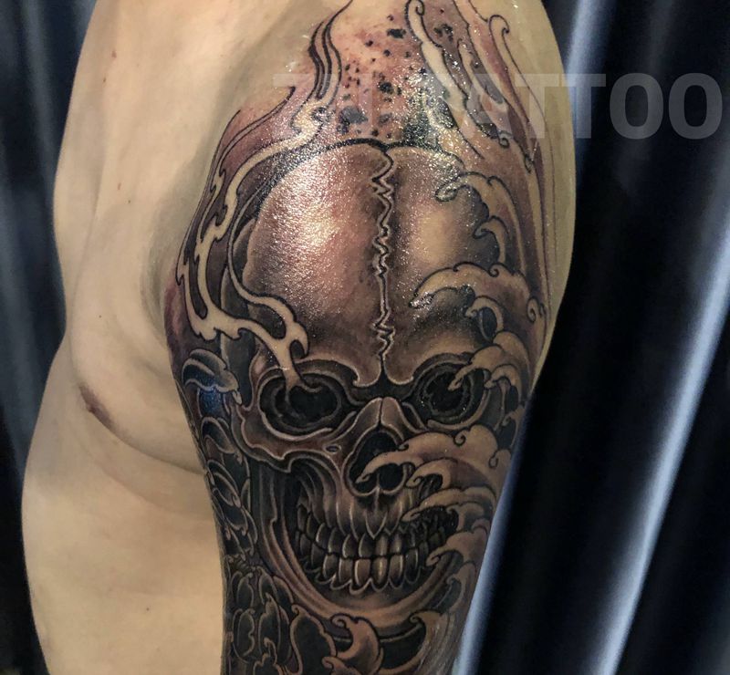 当前位置: 首页 >福建省三明市纹身店-执念刺青社纹身图案>传统骷髅纹身图片_手臂新传统纹身图案