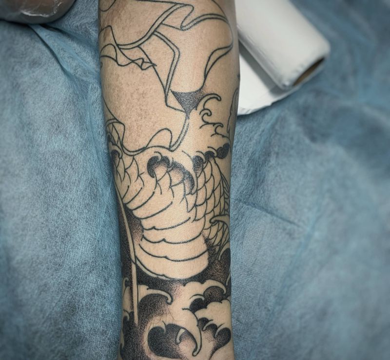 • T网红王老大花腿龙纹身图片_腿部新传统纹身图案